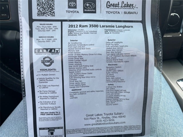 Completely serviced and safety inspected, buy with confidence, 4WD, LEATHER. 2012 Ram 3500 Laramie Longhorn Mineral Gray Metallic Clearcoat 4WD 6-Speed Automatic Cummins 6.7L I6 Turbodiesel