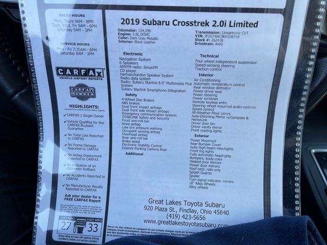 Completely serviced and safety inspected, buy with confidence, Purchased BRAND NEW here at Great Lakes Subar, all service records available!, Bluetooth®, MOONROOF, AWD, Carfax CERTIFIED Accident Free, LEATHER, NAVIGATION. 2019 Subaru Crosstrek 2.0i Limited Dark Gray Metallic AWD Lineartronic CVT 2.0L DOHC
